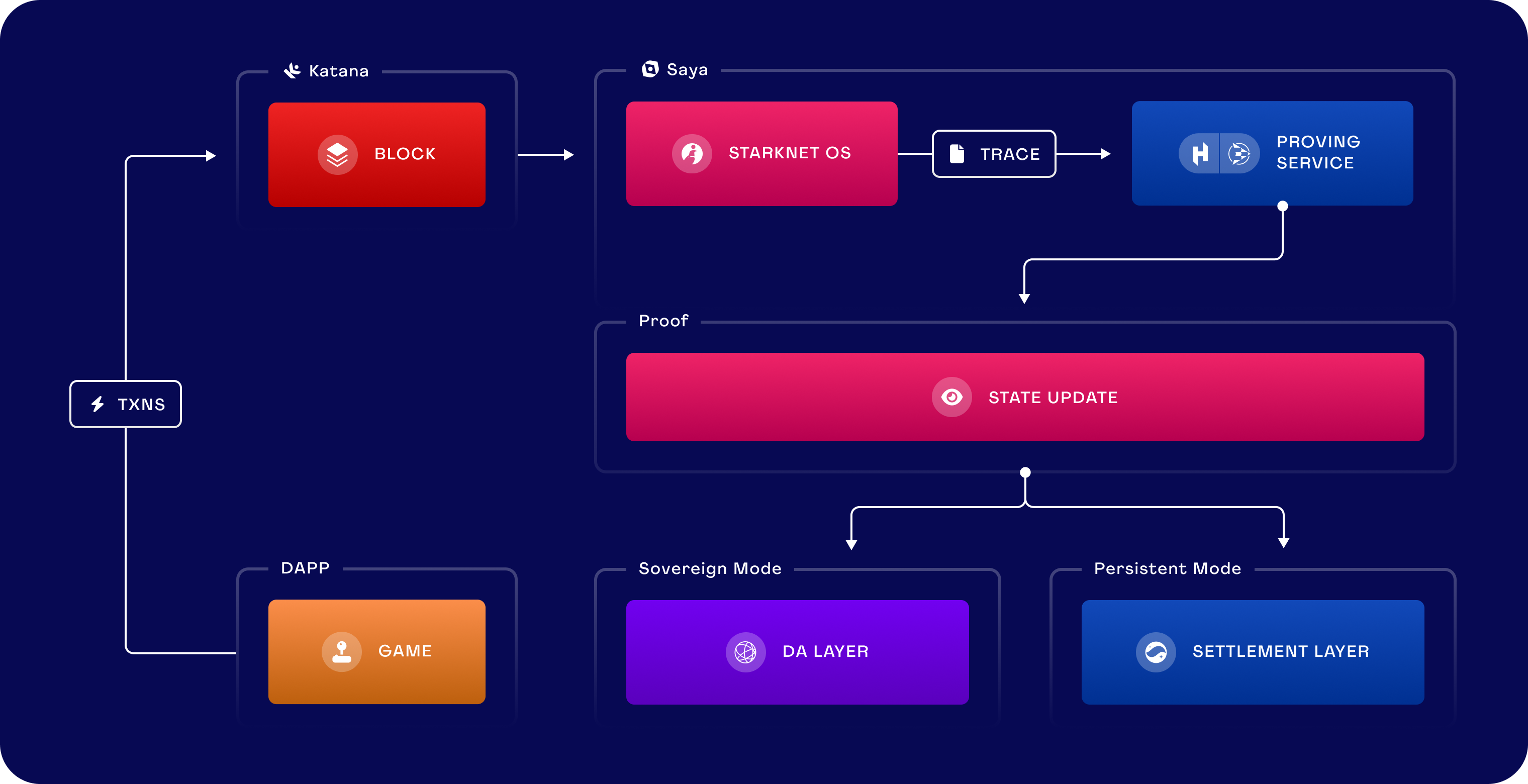 2. Sovereign mode: Saya will fetch the blocks from Katana and will post the proof and associated compressed state diff to a data availability layer.